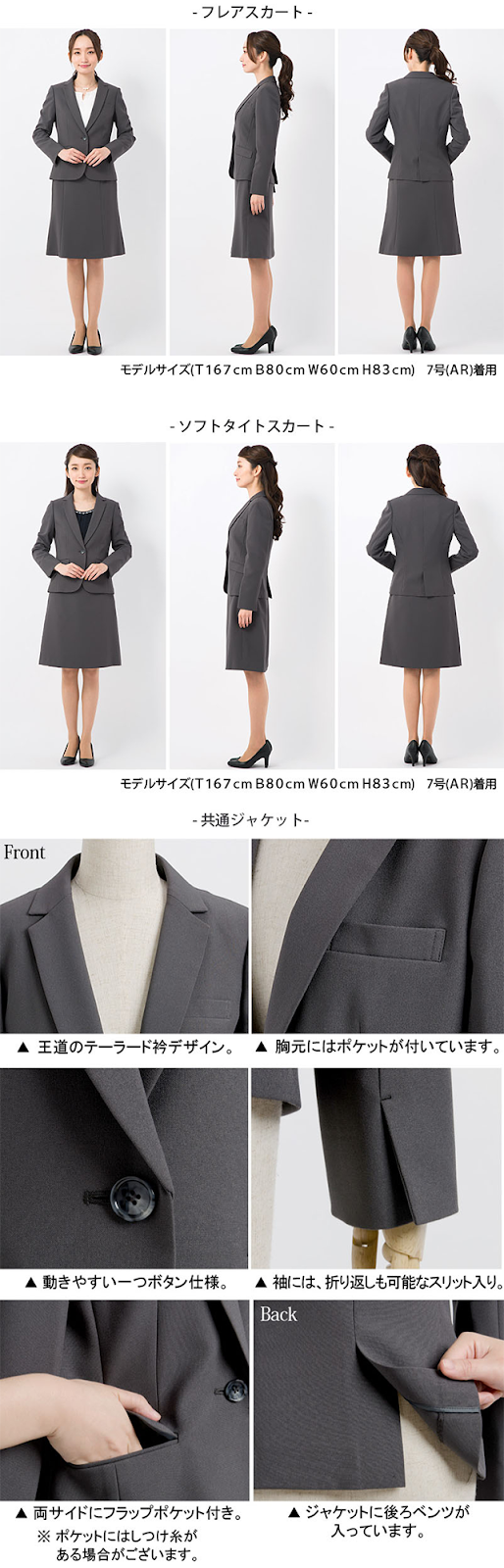 ◆女性らしいフレアスカートと、ビジネススタイルの王道、ソフトタイトデザインの2種類をご用意しました。